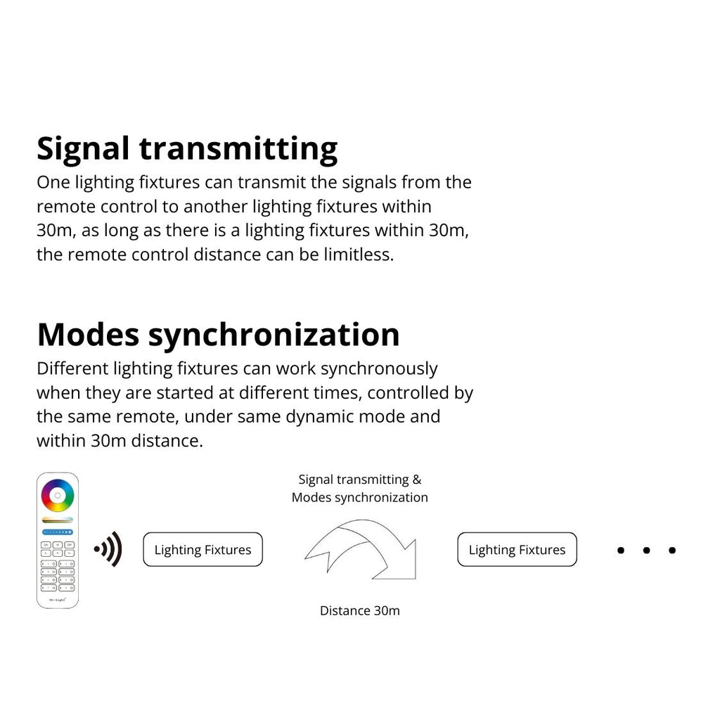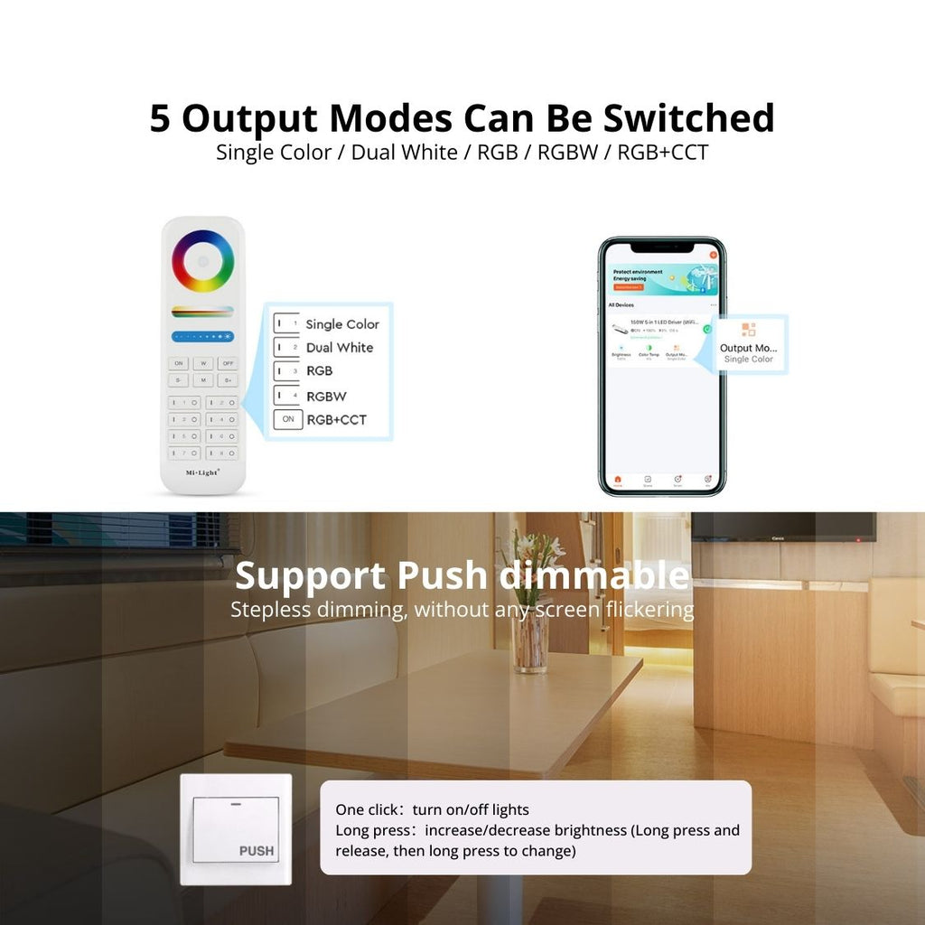 Multiple Output Modes: Switch between five output modes (Single color, Dual white, RGB, RGBW, RGB+CCT) with one button, providing versatile lighting options.