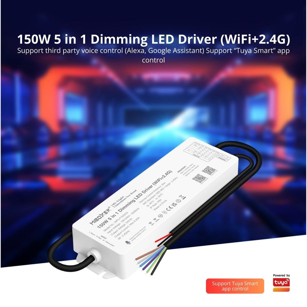 The 150W 5 in 1 Dimming LED Driver (WiFi+2.4G) delivers powerful, flexible, and smart lighting control with app integration, voice control, and durable construction for any environment.